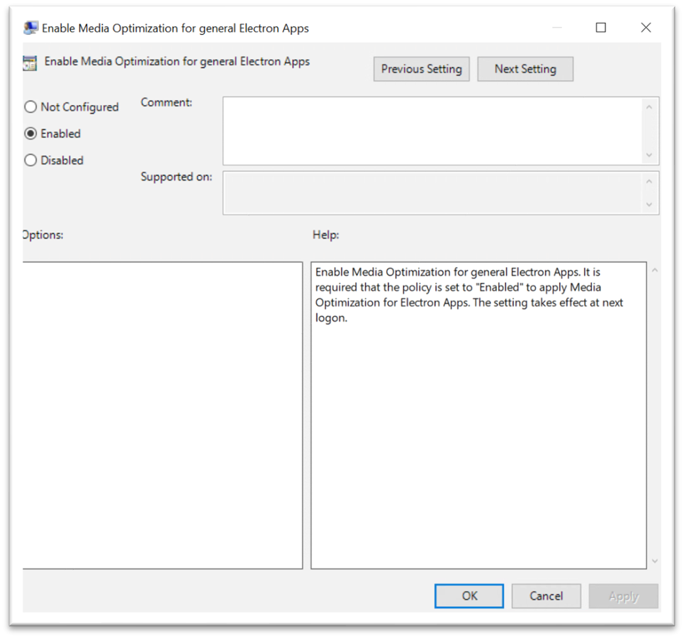 Set Enable Media Optimization for general Electron Apps policy to the state of Enabled