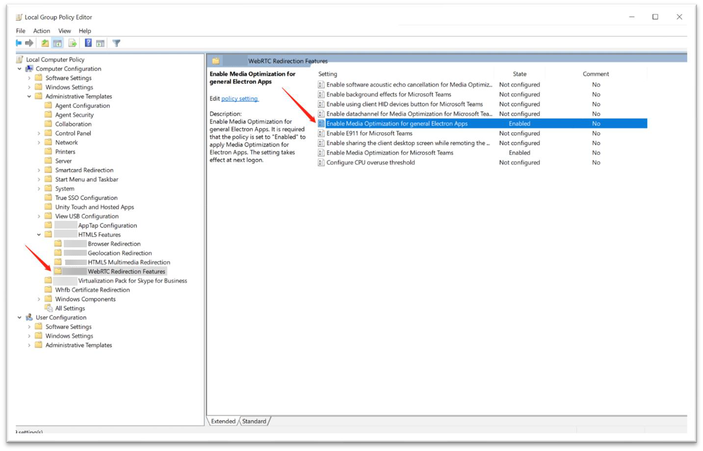 To enable WebRTC Redirection on the agent machine using the GPO editor:¶